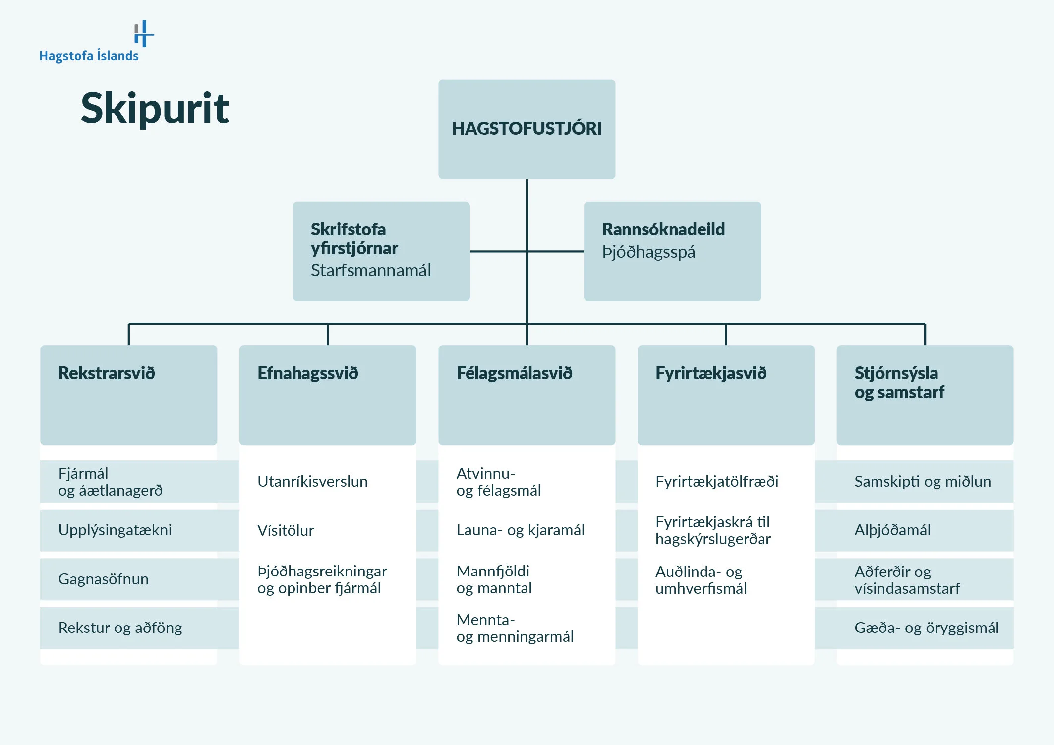 Hagstofan skiptist í fimm svið; félagsmálasvið, fyrirtækjasvið, efnahagssvið, rekstrarsvið og stjórnsýslu og samstarf.